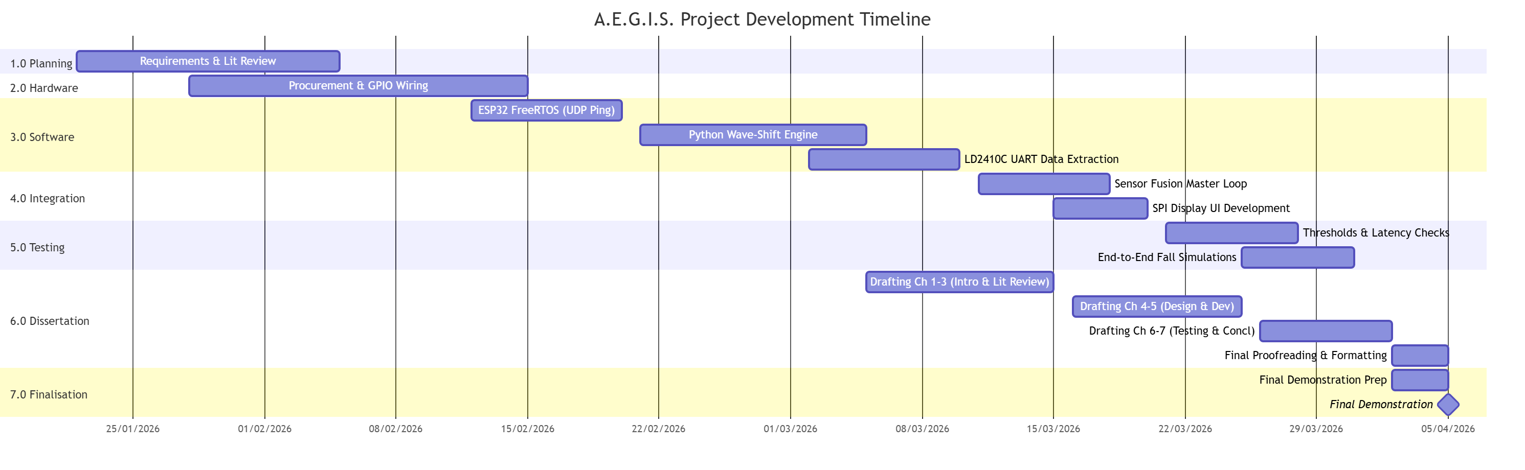With the WBS outlining what needed to be done, I used a Gantt chart to map out when it would happen. Hardware and software projects are heavily dependent on sequence. For instance, I physically cannot calibrate the Python kinetic variance thresholds until the ESP32 network is successfully generating an autonomous Wi-Fi stream.
